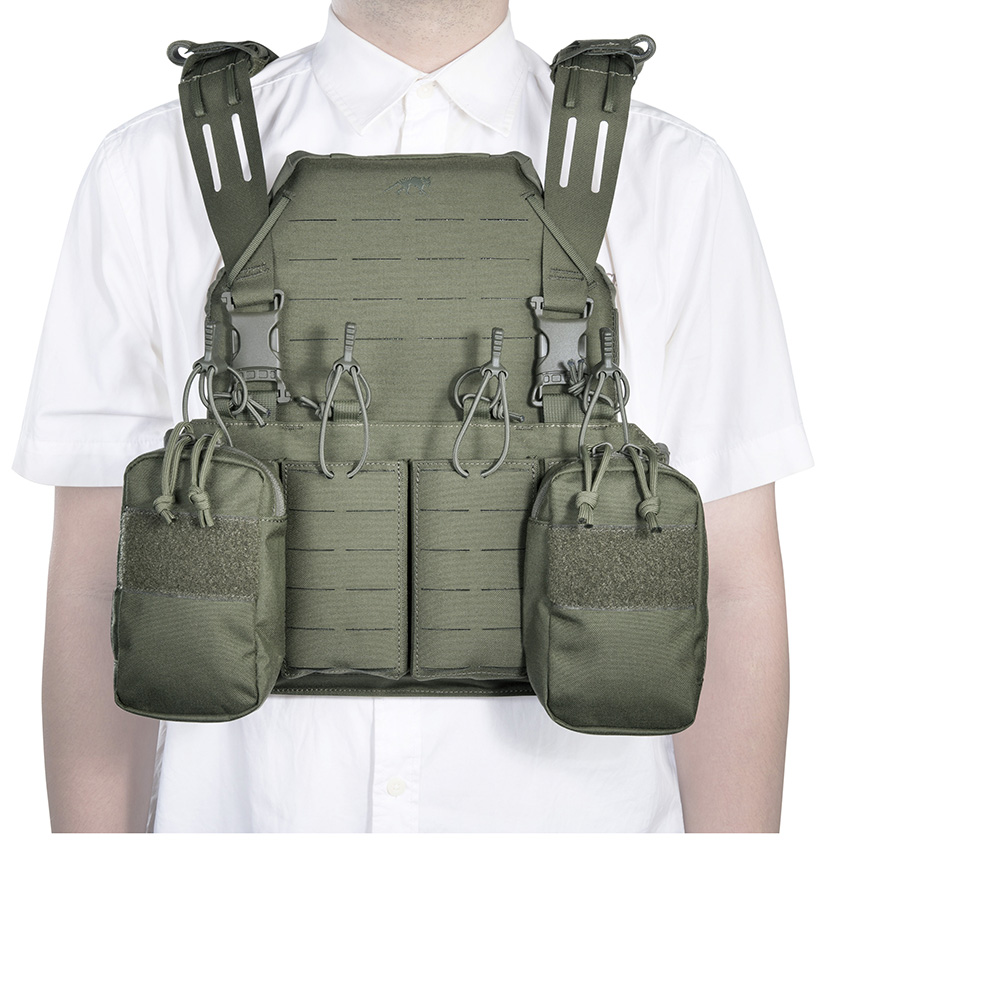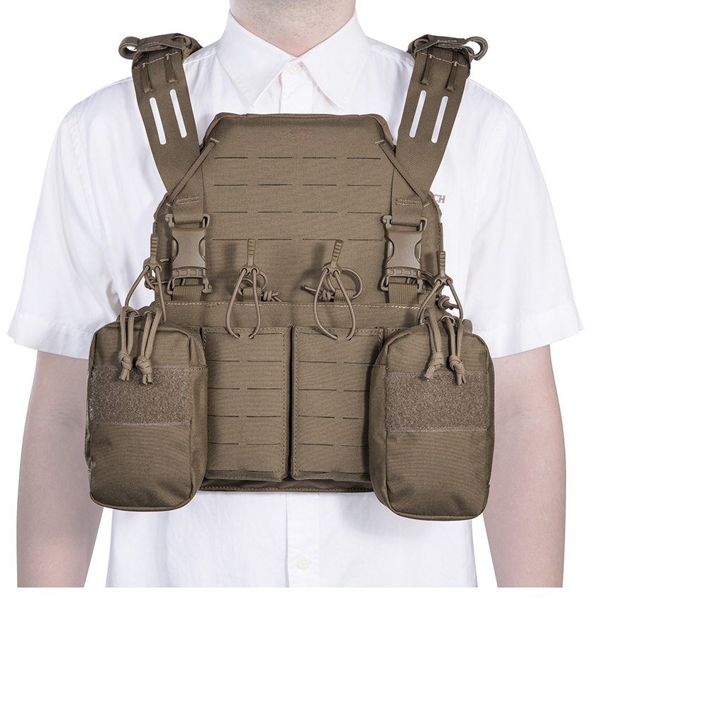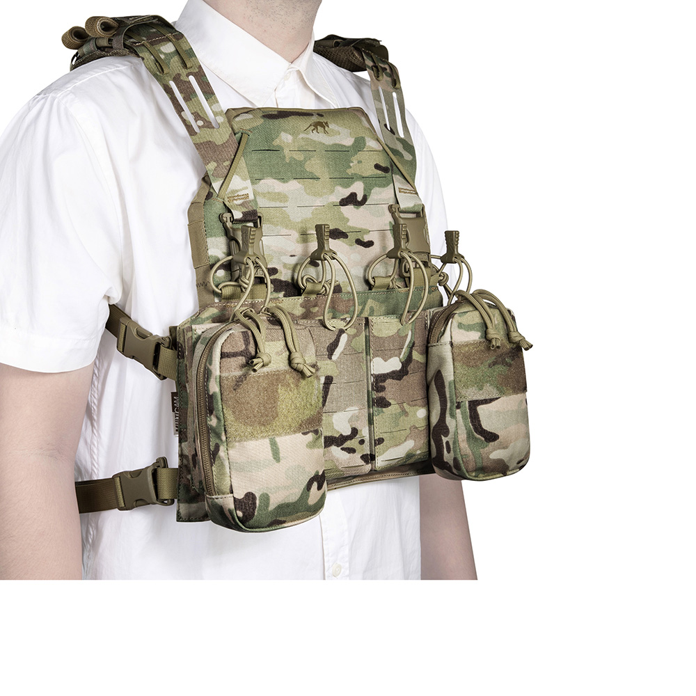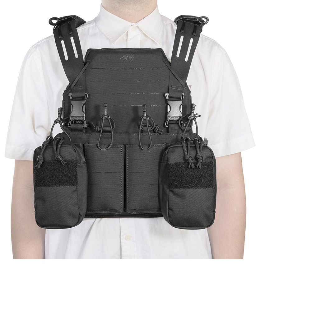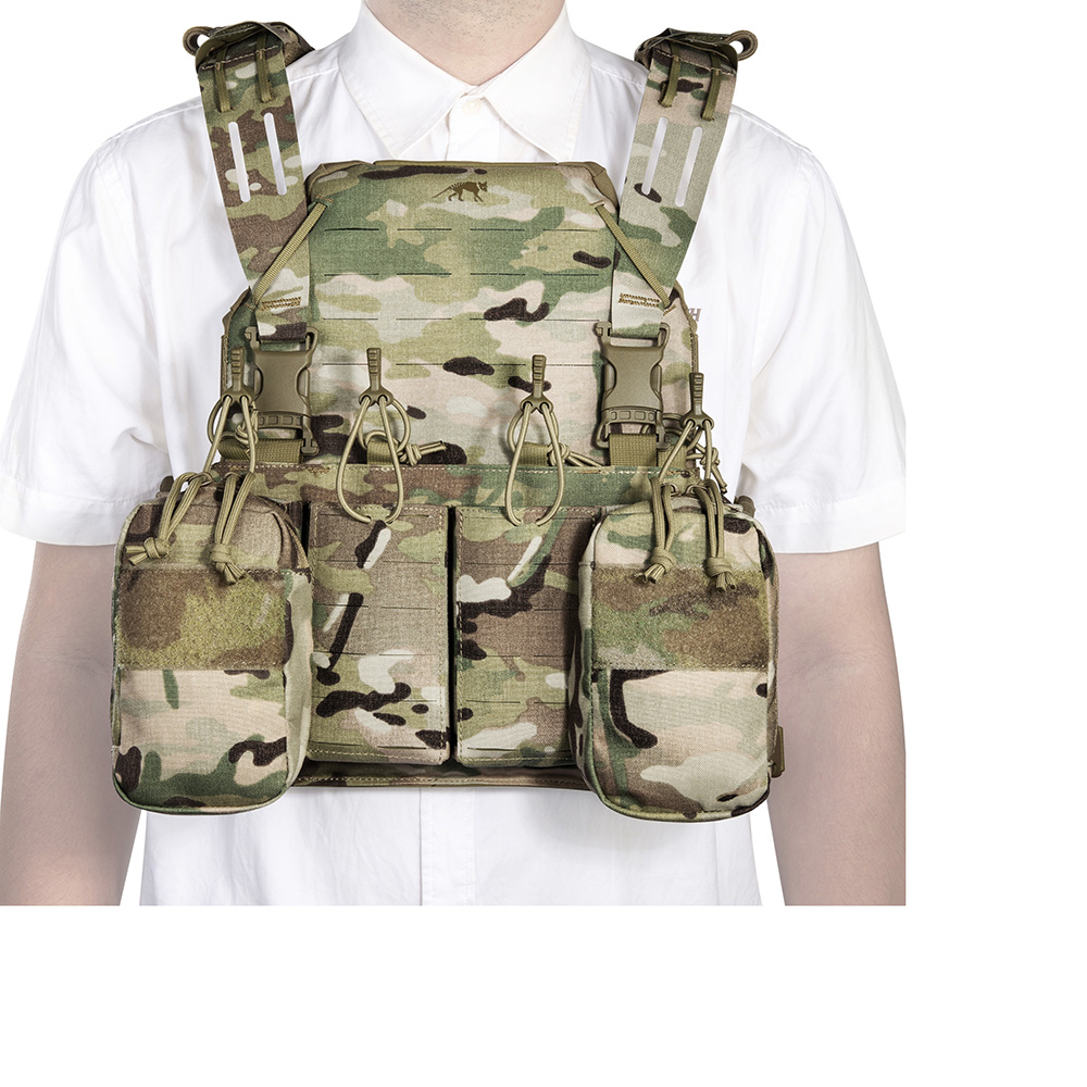 Flat chest rig with four fixed magazine pouches, detachable side pouches and front flap with hook & loop fastening for size M SAPI plates. The TT Modular Chest Rig M4x4 features MOLLE in laser-cut design and can be combined with the TT Modular Chest Rig Pack. It can also be attached to plate carriers. Removable shoulder pads are included.
