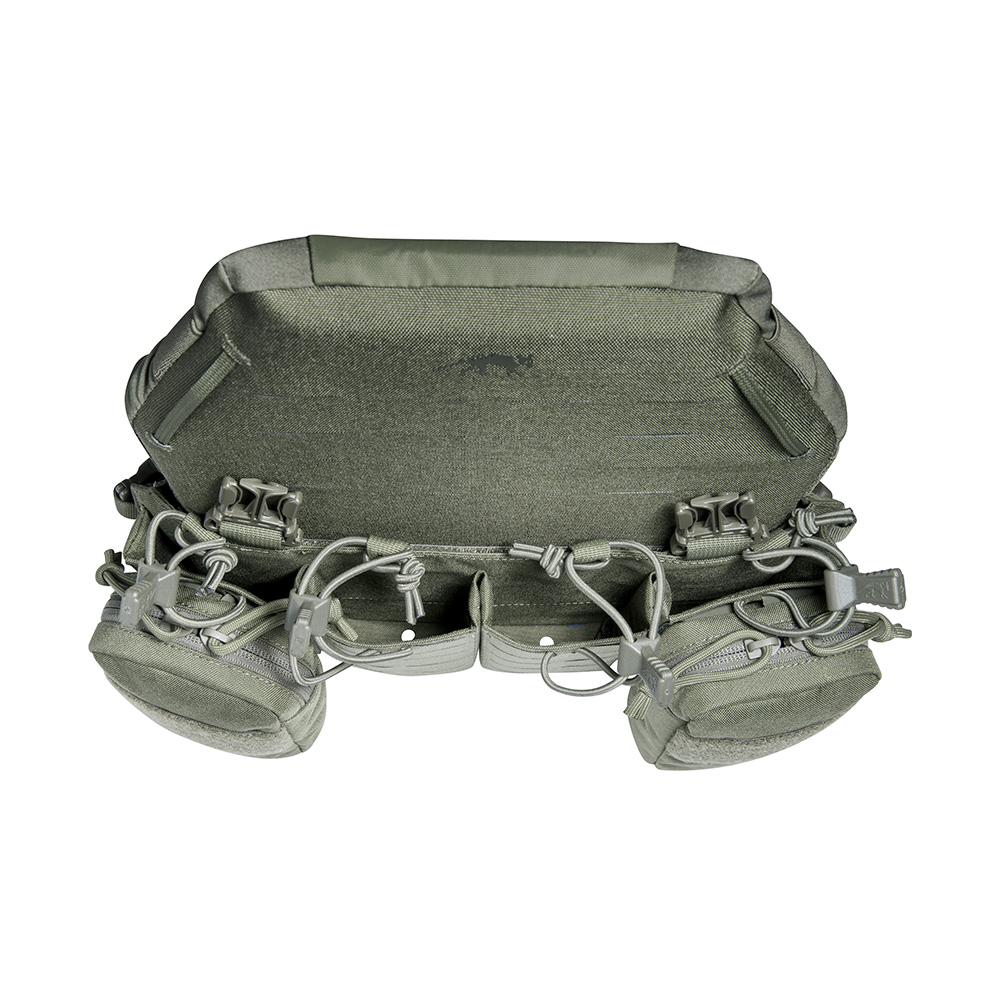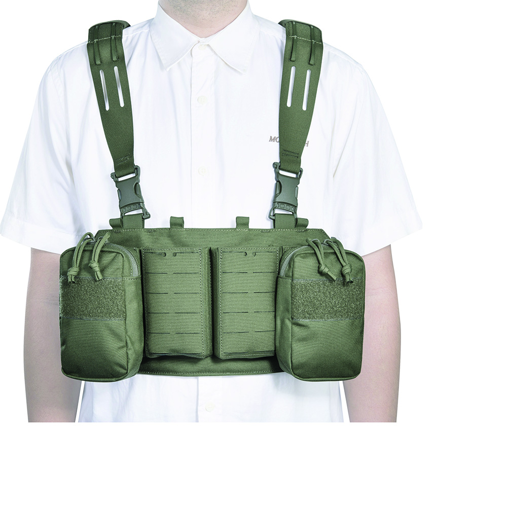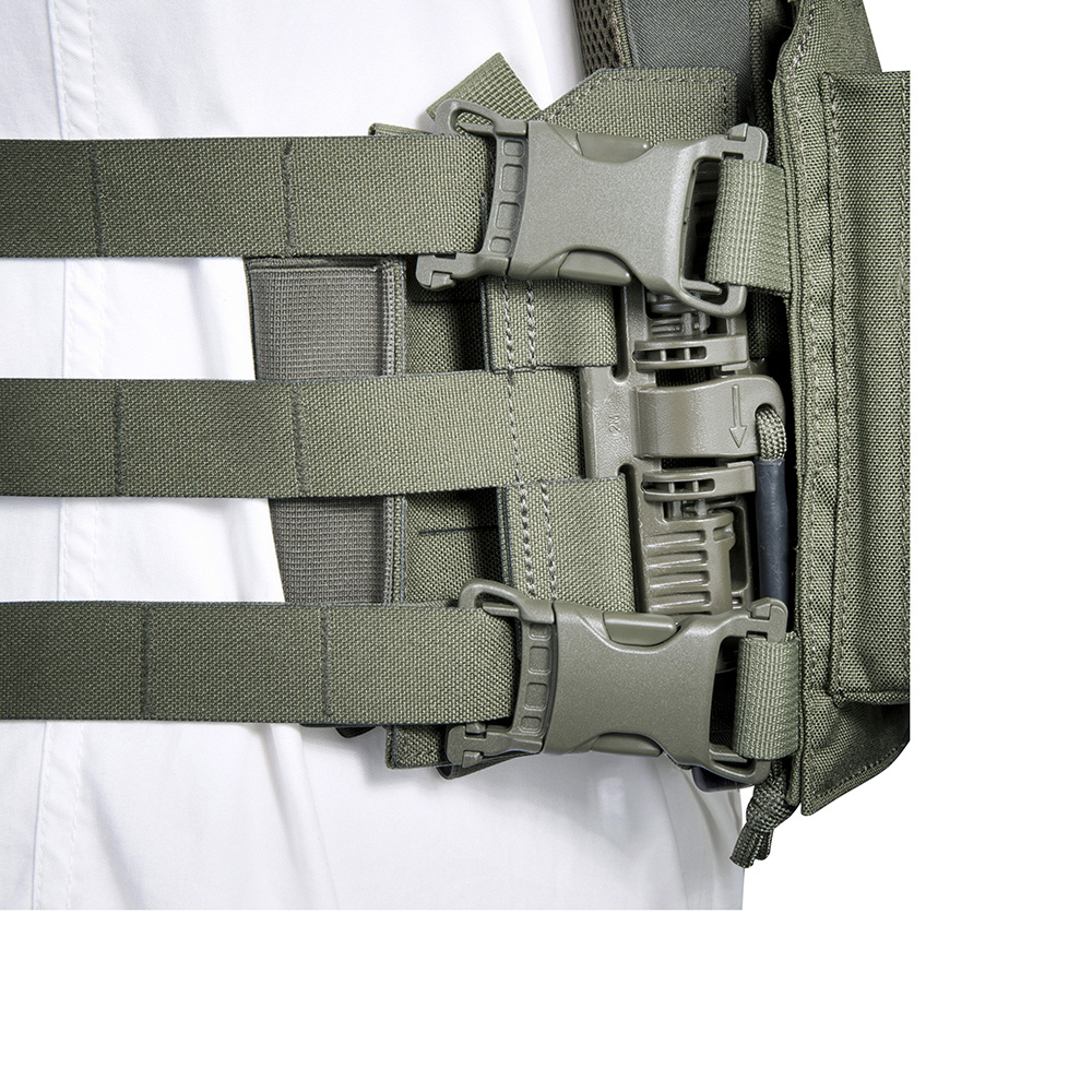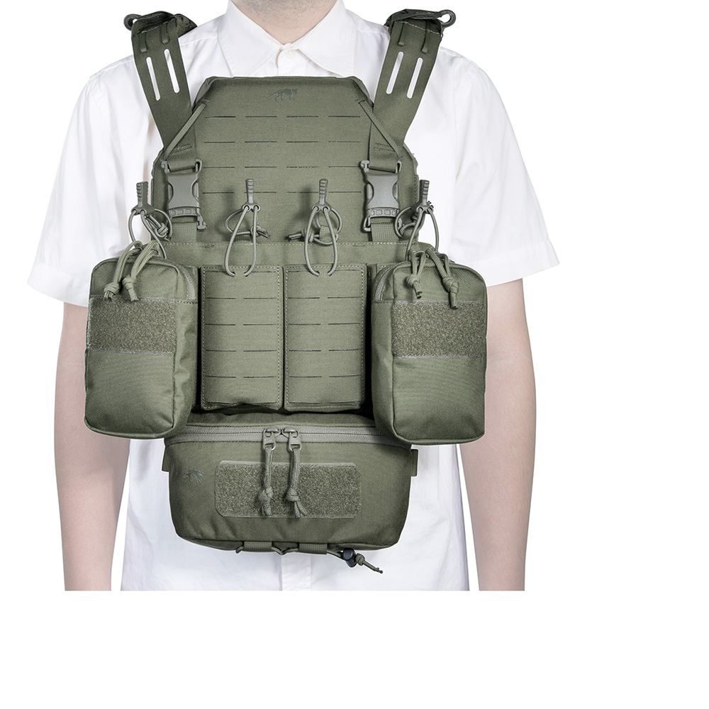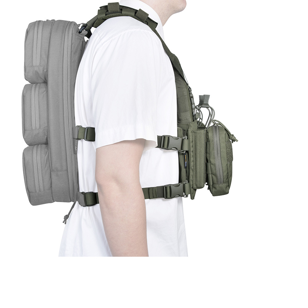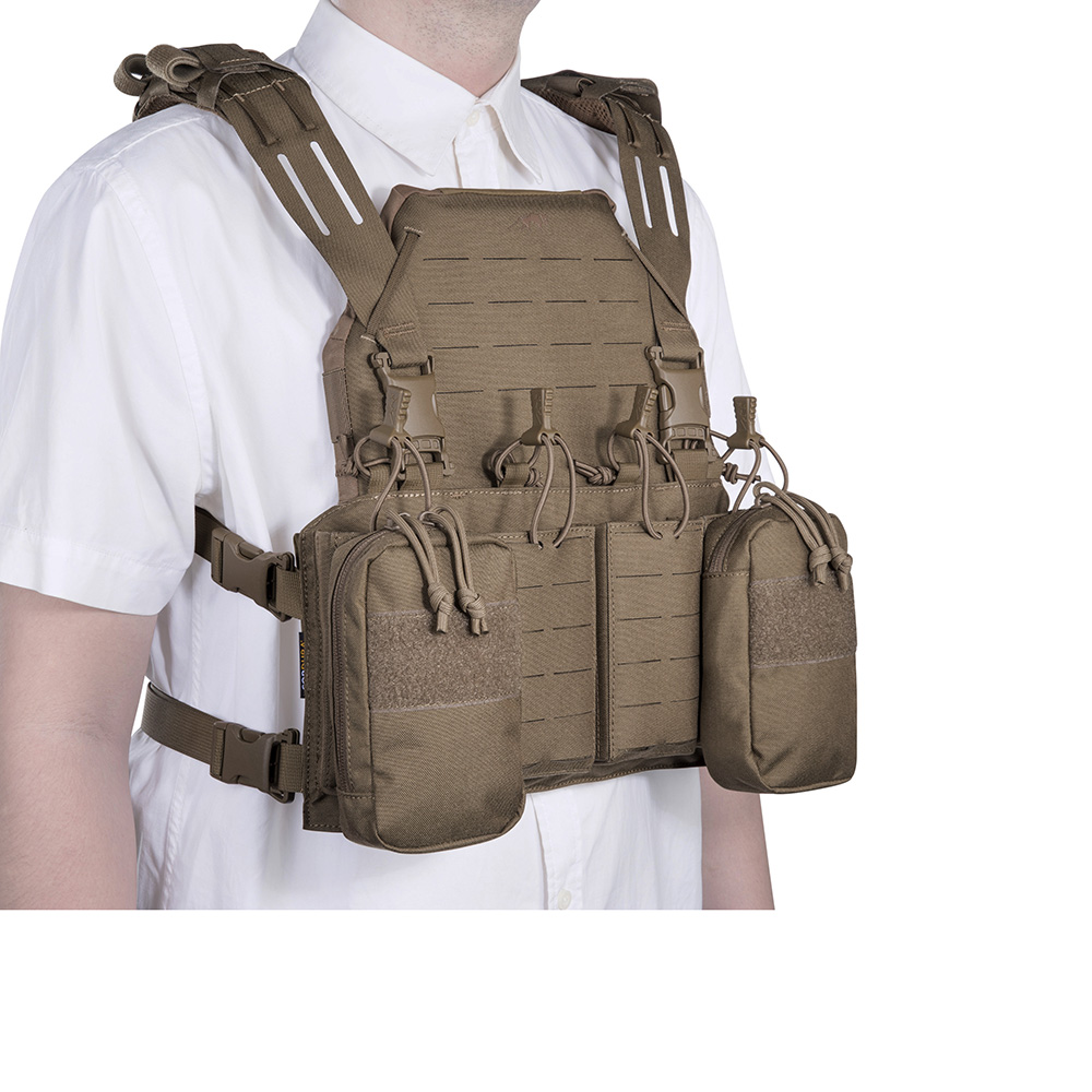 Flat chest rig with four fixed magazine pouches, detachable side pouches and front flap with hook & loop fastening for size M SAPI plates. The TT Modular Chest Rig M4x4 features MOLLE in laser-cut design and can be combined with the TT Modular Chest Rig Pack. It can also be attached to plate carriers. Removable shoulder pads are included.