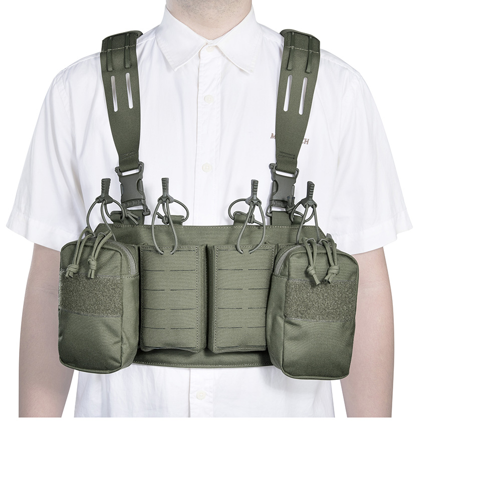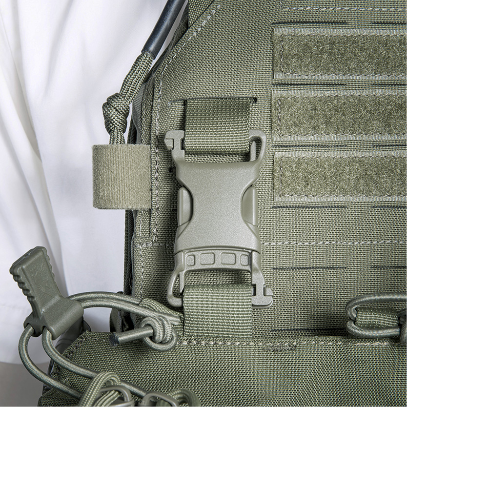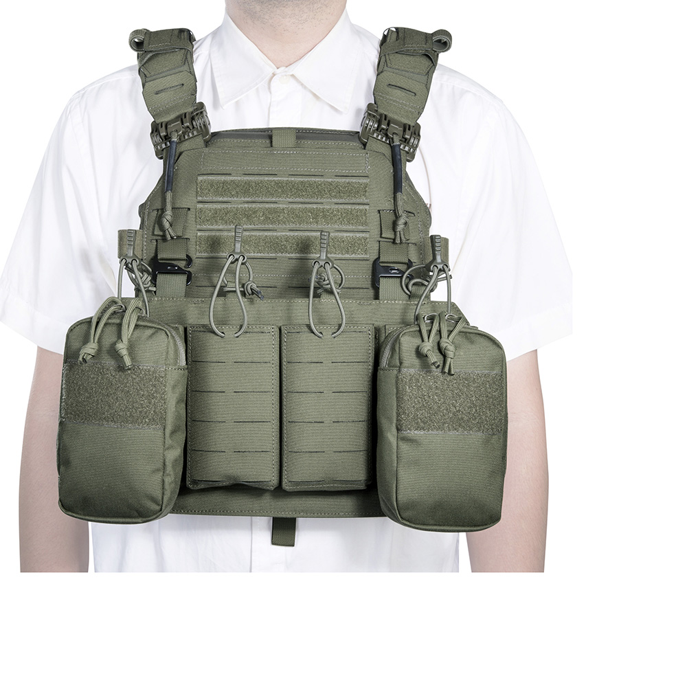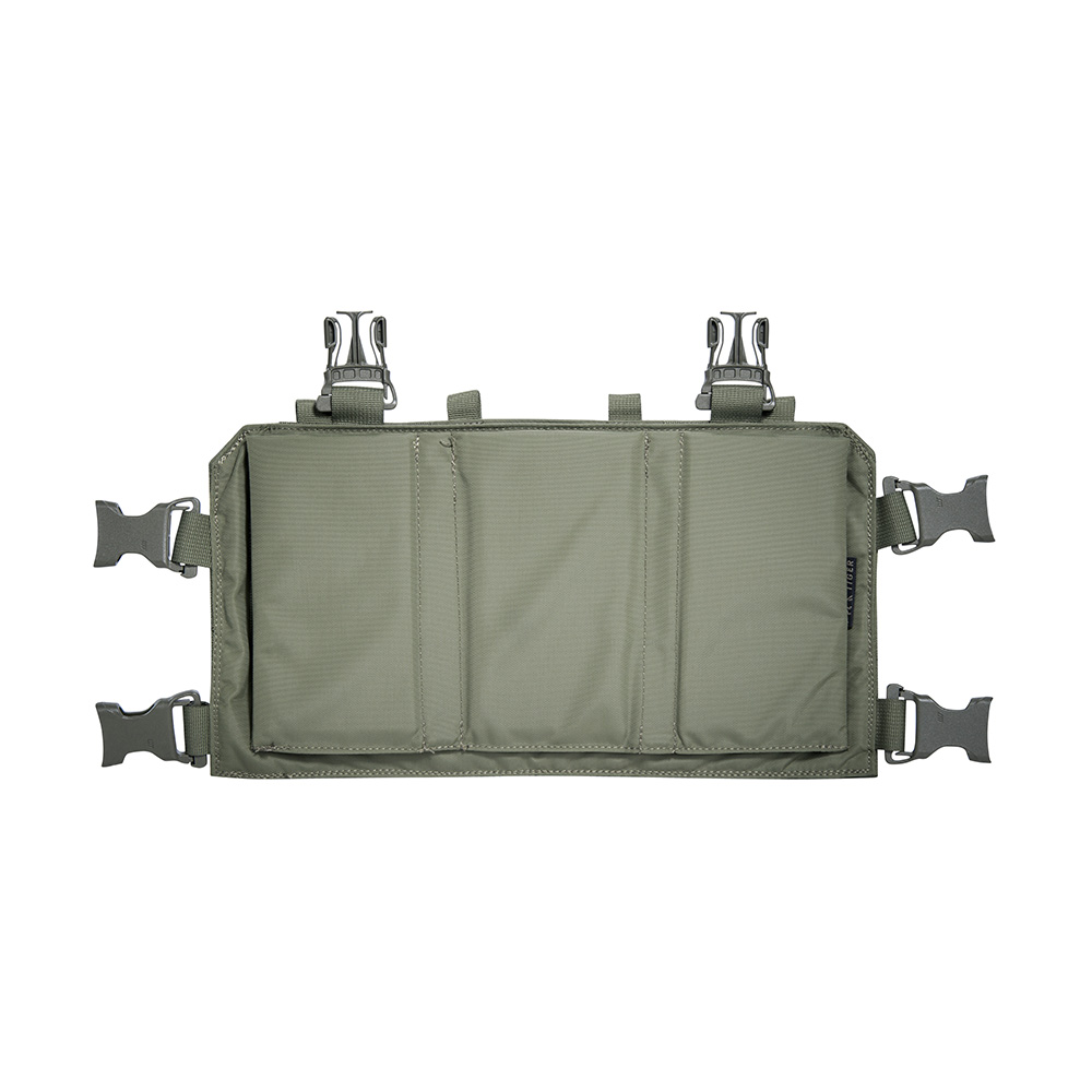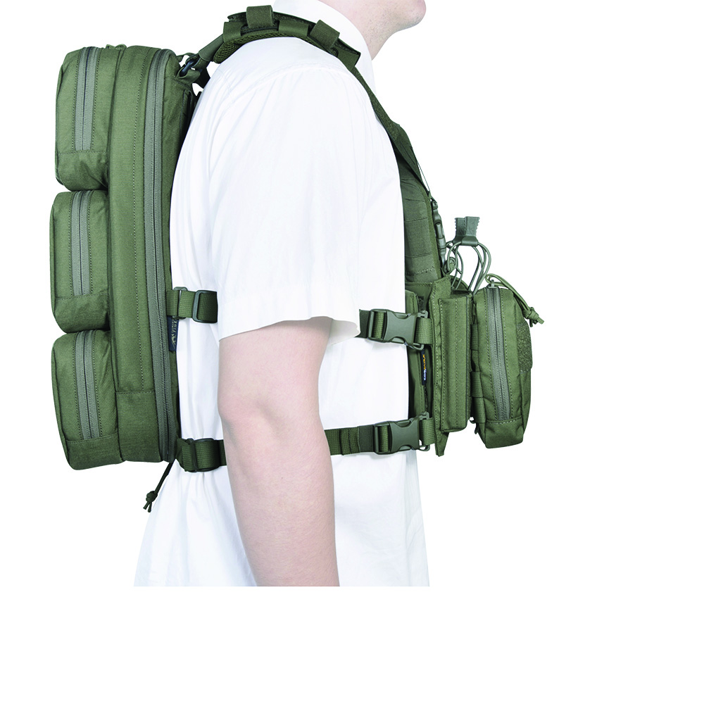 Flat chest rig with four fixed magazine pouches, detachable side pouches and front flap with hook & loop fastening for size M SAPI plates. The TT Modular Chest Rig M4x4 features MOLLE in laser-cut design and can be combined with the TT Modular Chest Rig Pack. It can also be attached to plate carriers. Removable shoulder pads are included.