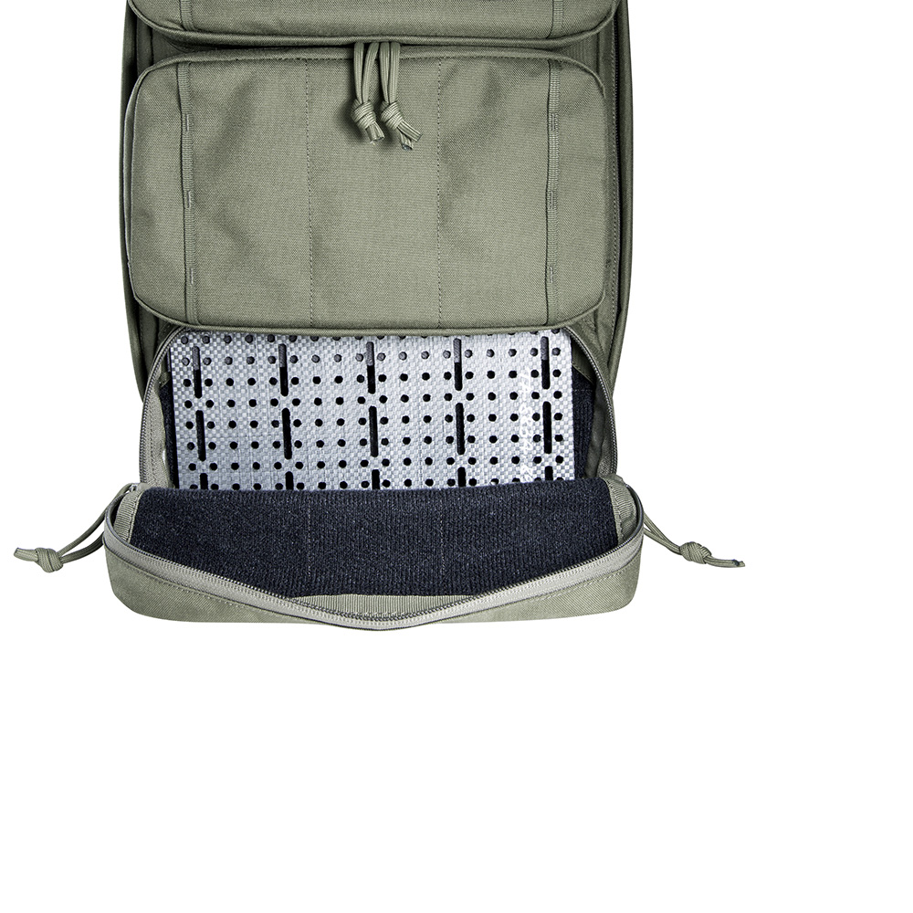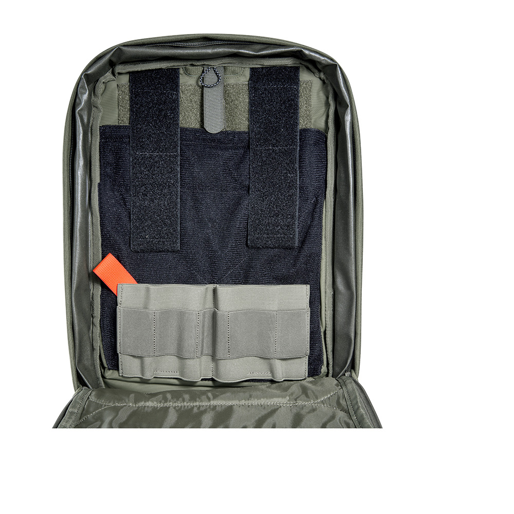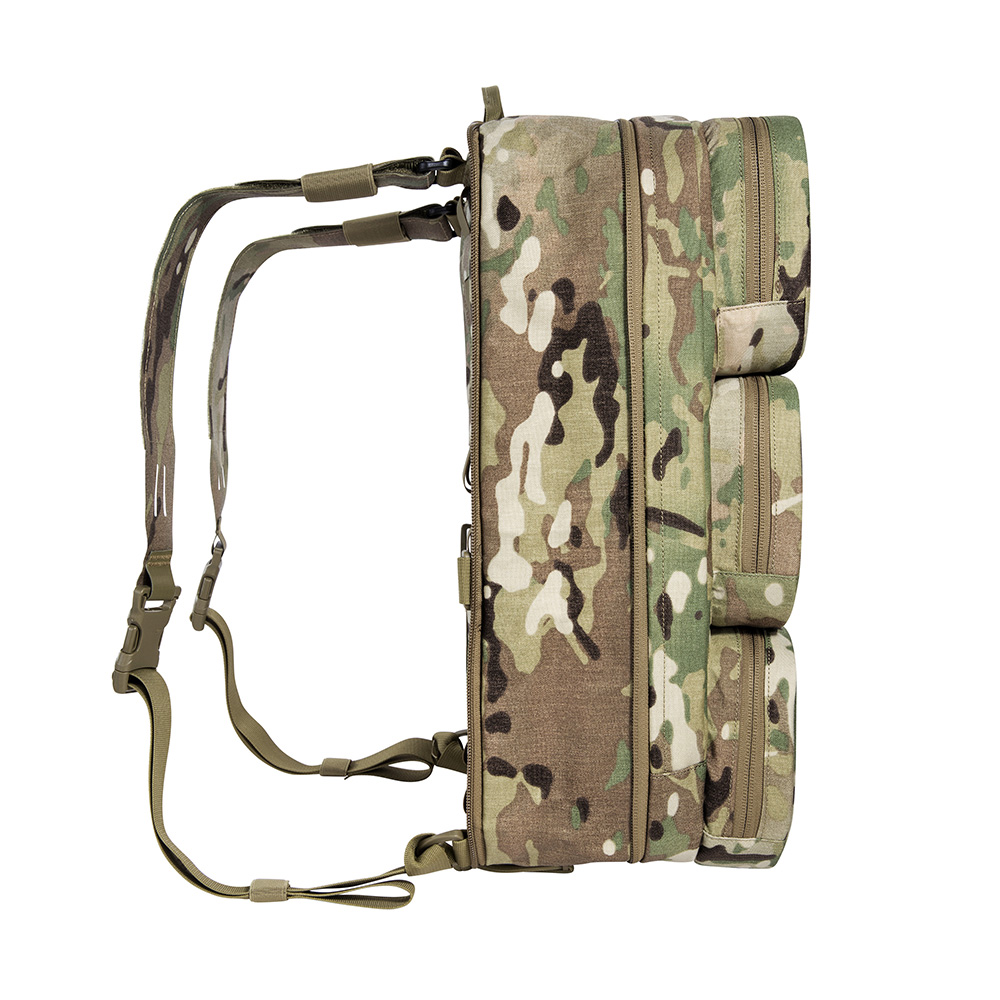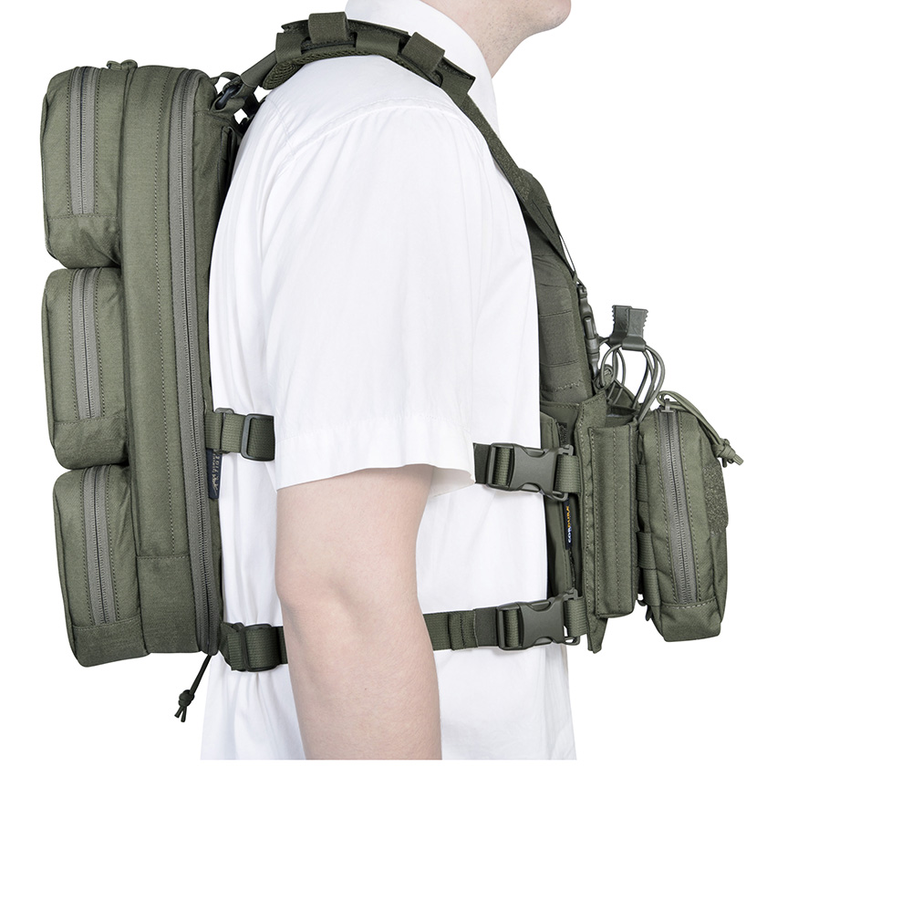 Backpack with insert for a ballistic plate to complement the TT Modular Chest Rig M4x4. The TT Modular Chest Rig Pack is designed for use with the TT Modular Chest Rig M4x4. It can also be attached to plate carriers (adapter included) or used on its own. The backpack has a main compartment, three front pockets and a slot for a ballistic plate. The volume can be varied between 12 Liters and 20 liters. Can also be worn as a back piece on the TT Chest Rig MK II and TT Chest Rig MK II M4 with the supplied adapters.