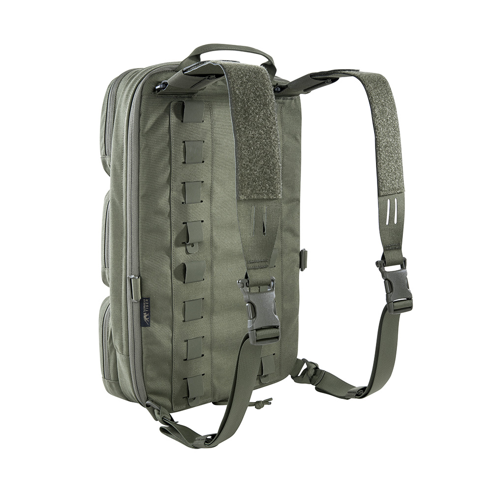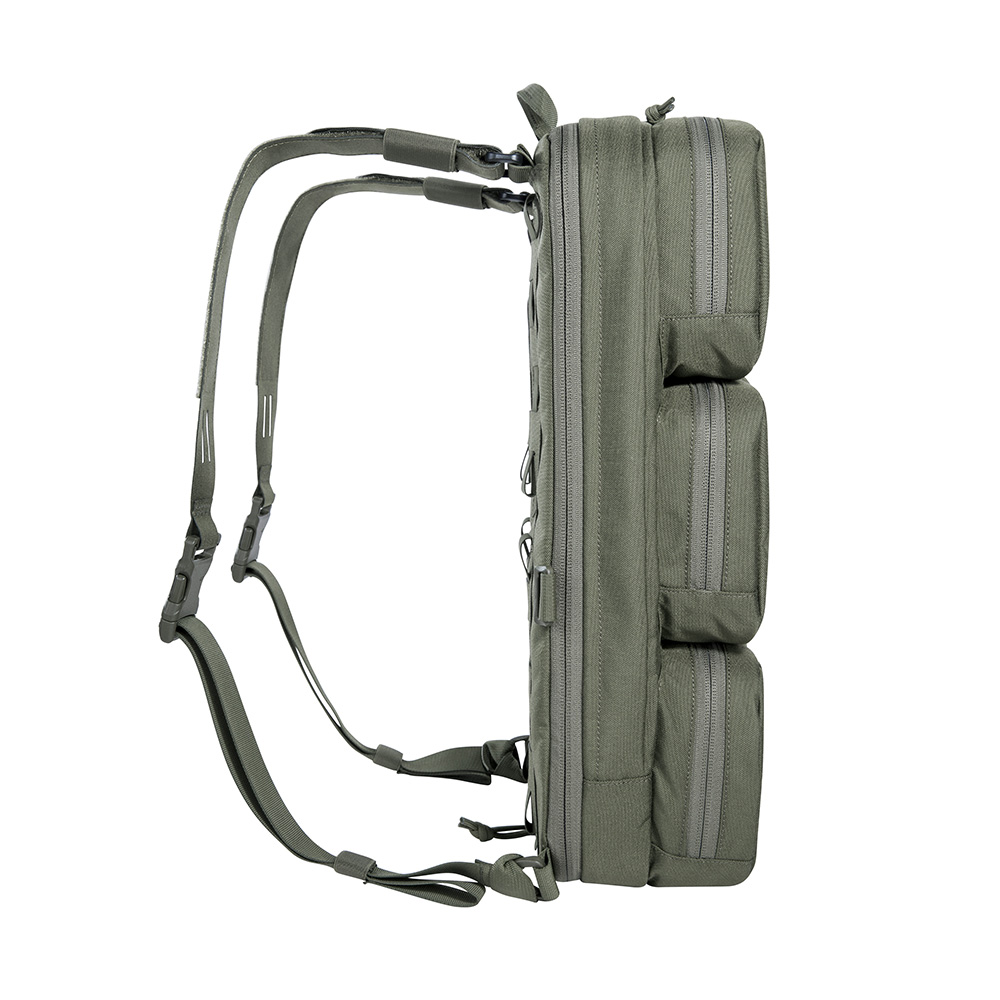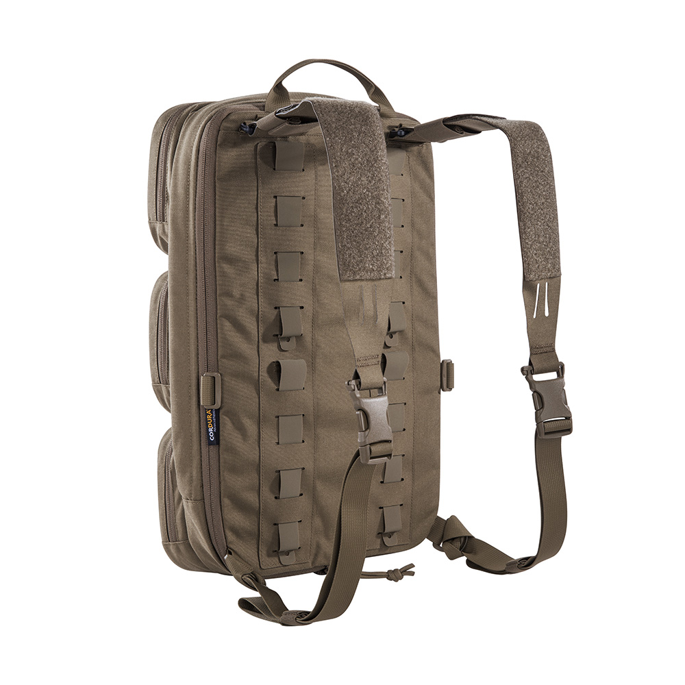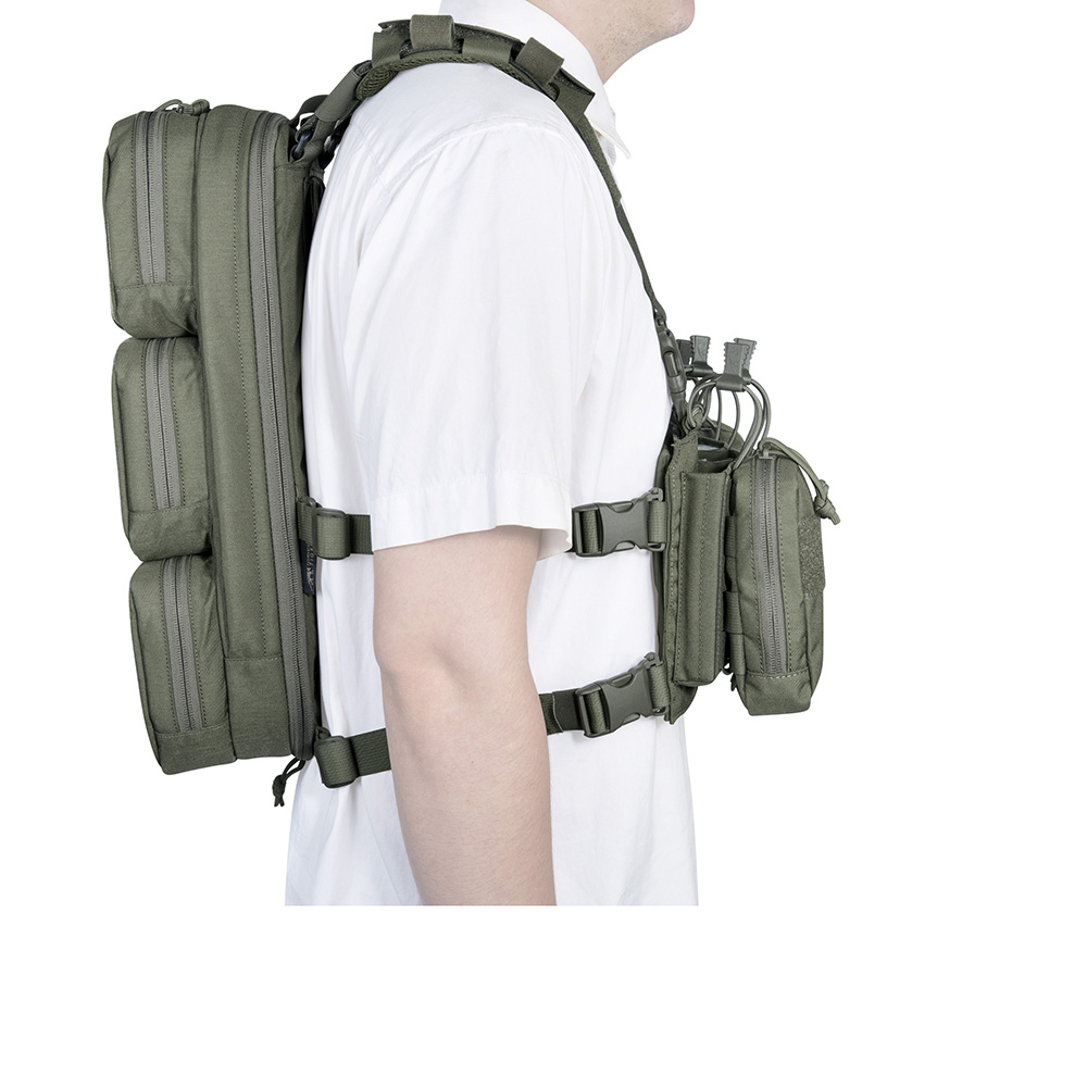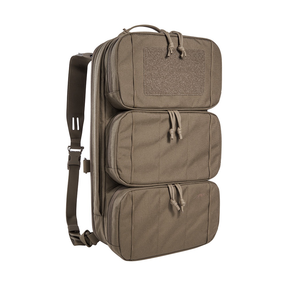 Backpack with insert for a ballistic plate to complement the TT Modular Chest Rig M4x4. The TT Modular Chest Rig Pack is designed for use with the TT Modular Chest Rig M4x4. It can also be attached to plate carriers (adapter included) or used on its own. The backpack has a main compartment, three front pockets and a slot for a ballistic plate. The volume can be varied between 12 Liters and 20 liters. Can also be worn as a back piece on the TT Chest Rig MK II and TT Chest Rig MK II M4 with the supplied adapters.